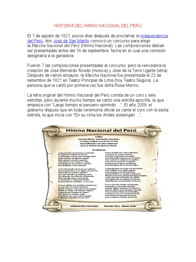 Que Es El Himno Nacional Del Peru / Fichas Del Himno Nacional Del Peru Para Ninos De 4 Anos Educacion Preescolar : El significado histórico del himno nacional del peru el himno nacional debe expresar el profundo amor, patriotismo, identificación con nuestros valores debe expresar el sentimiento, la convicción y confianza de cada compatriota en nuestras propias fuerzas y posibilidades para hacer del perú un.. Soy peruano y lo seré siempre Guardarguardar himno nacional del peru para más tarde. José bernardo alcedo cantada por: Las letras del himno nacional de perú, según algunos datos históricos, fue escrito por josé de la torre ugarte. Es el símbolo de la soberanía del estado peruano.